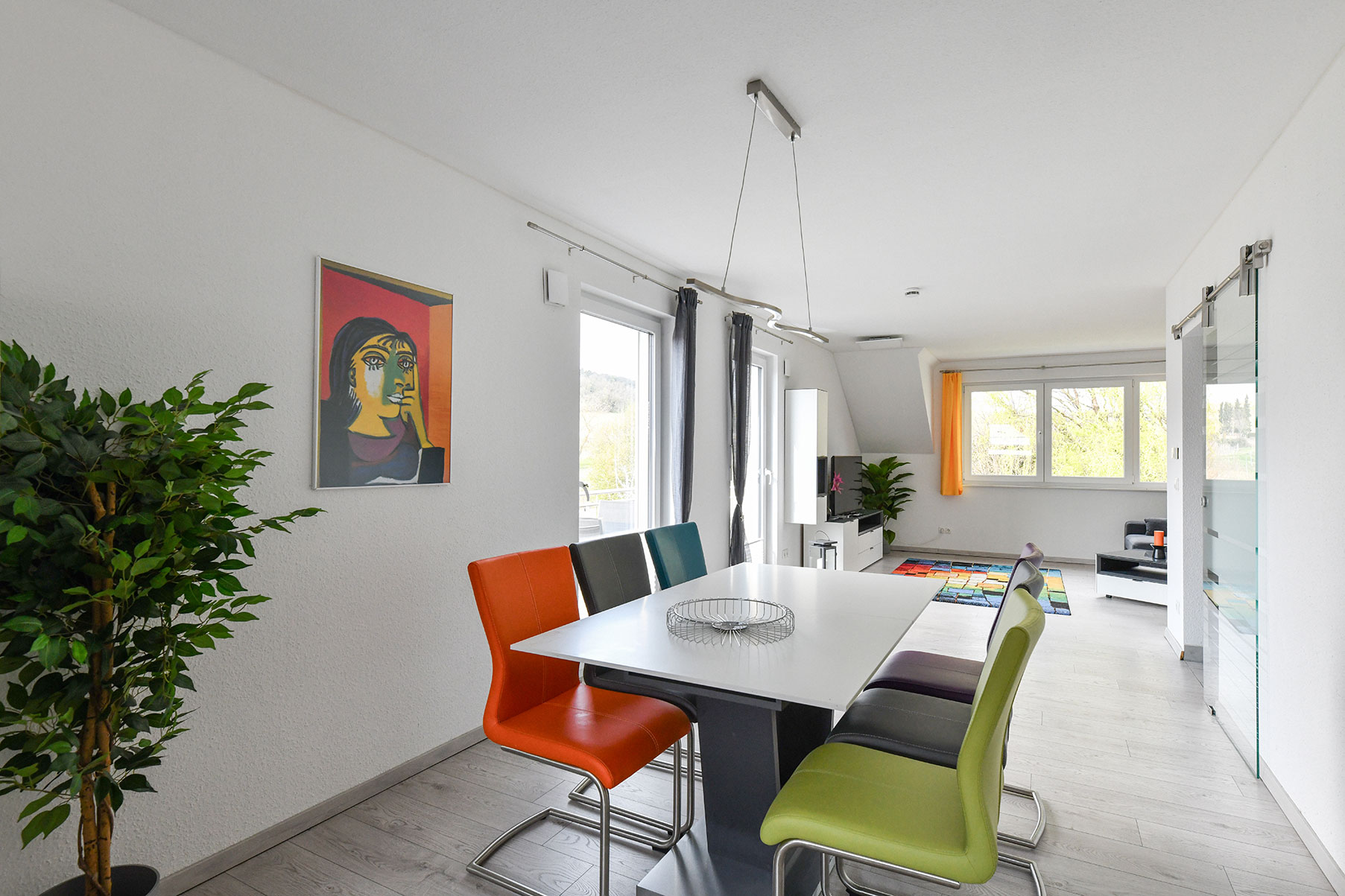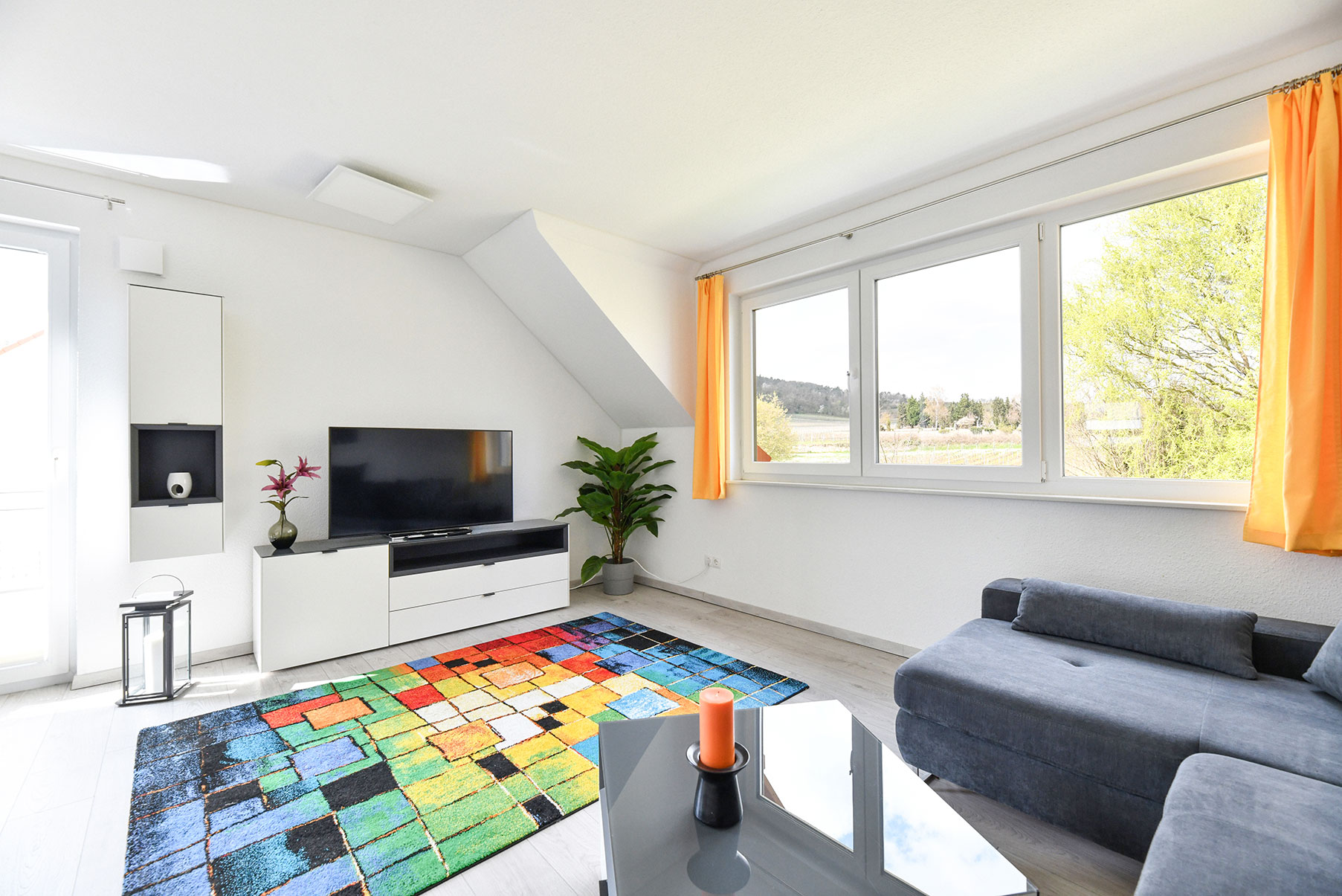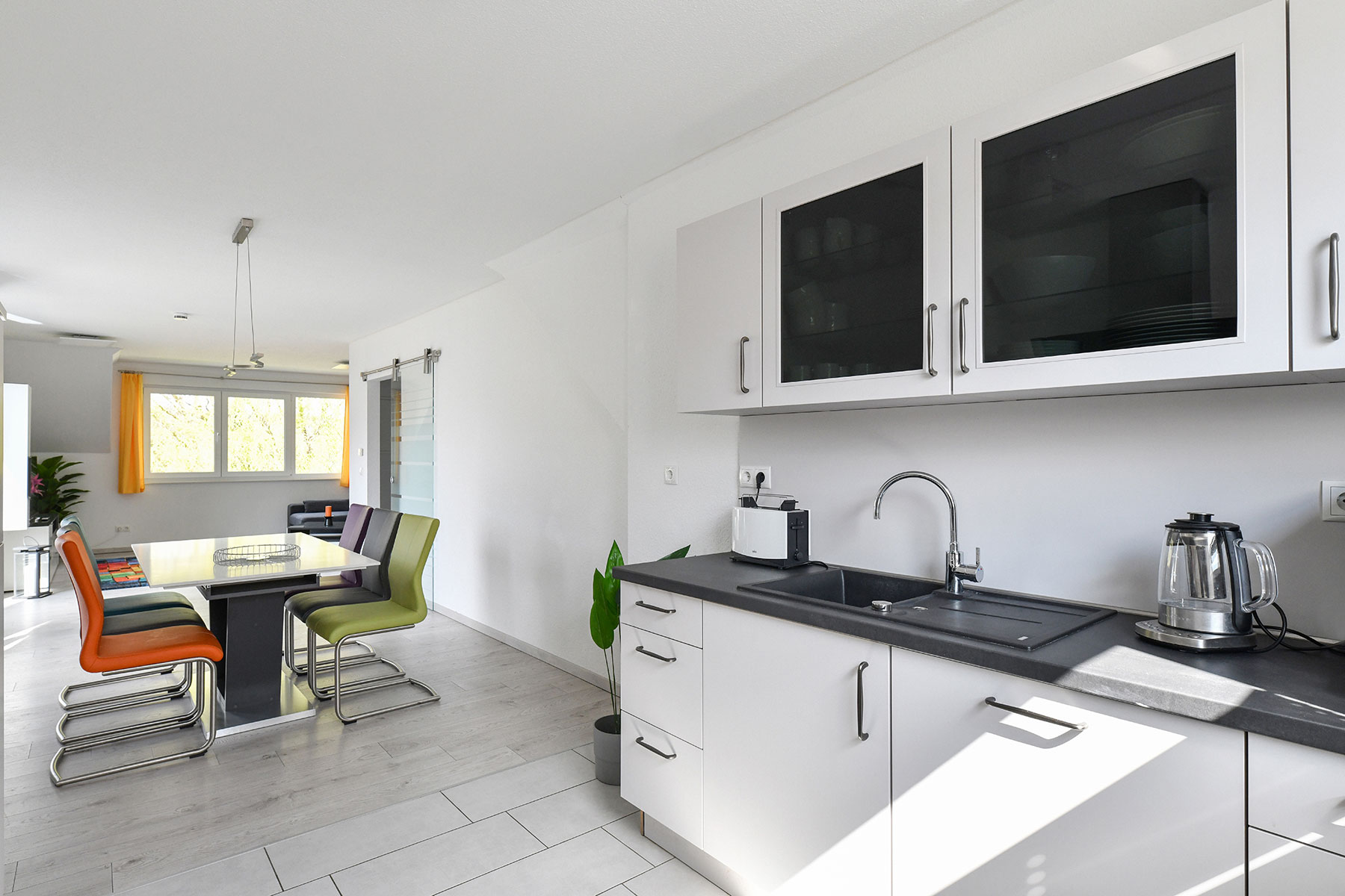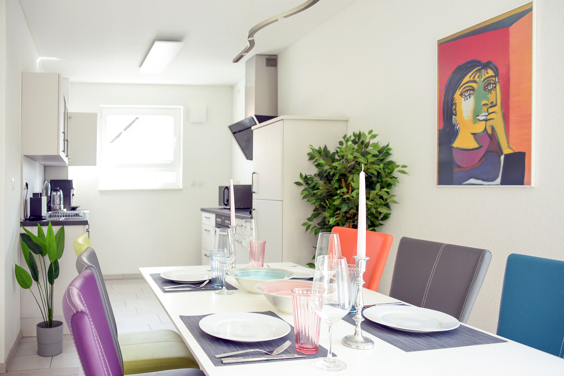 Die Ferienwohnung im 1. OG mit Balkon liegt ruhig am Ortsende und grenzt unmittelbar an das Naturschutzgebiet Berntal. Sie ist im puristischen Design mit fröhlichen Farbakzenten eingerichtet und hochwertig ausgestattet. Die offene Bauweise von Küche, Essbereich und Wohnzimmer mit großem kuschligem Sofa lädt zur gemeinsamen Zeit ein. Der große Smart-TV mit Magenta-TV ermöglicht den spannenden Spielfilmabend. Die Designerküche verfügt über einen Kühlschrank mit Gefrierfach und Backofen, Geschirrspülmaschine, Kaffeevollautomat, Wasser-/Teekocher, Toaster und ein überdurchschnittliches Sortiment an Geschirr und Kochutensilien.