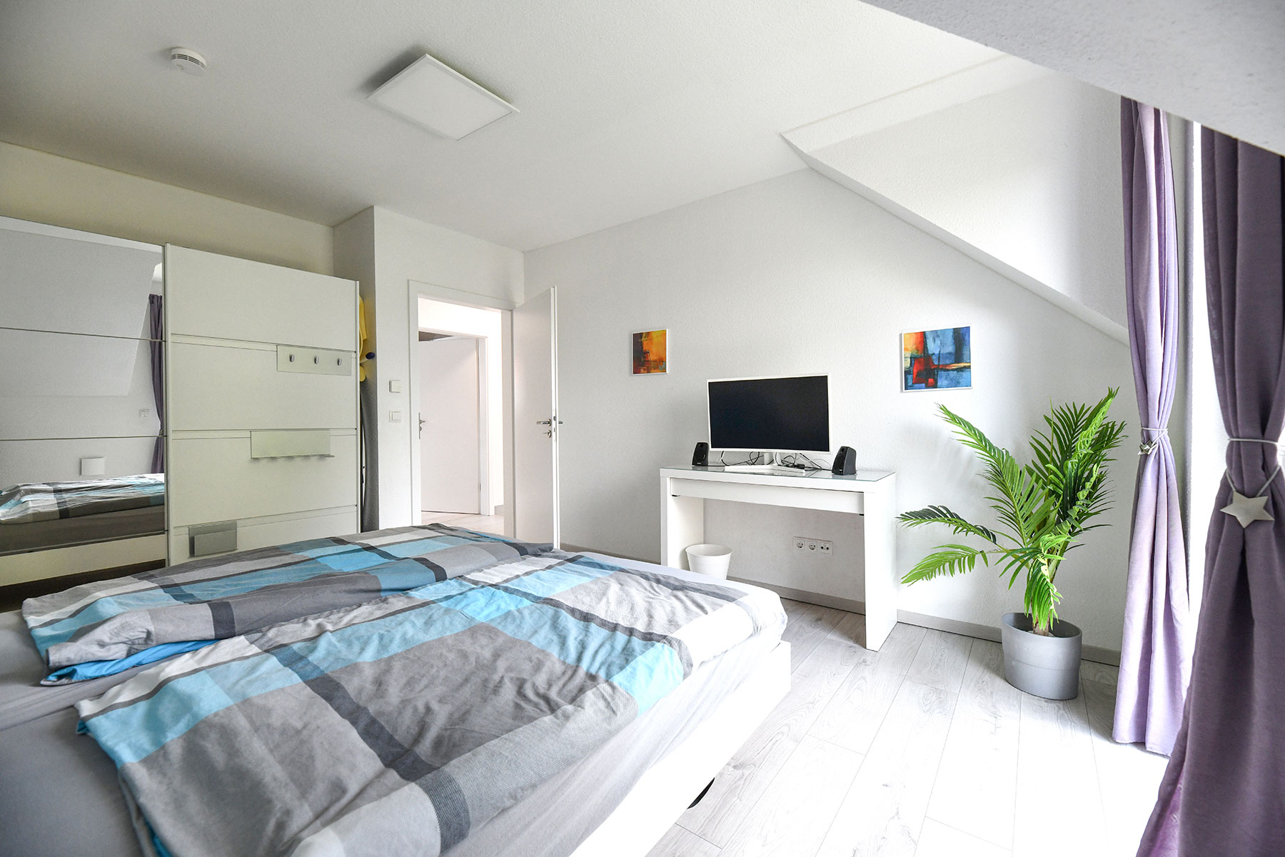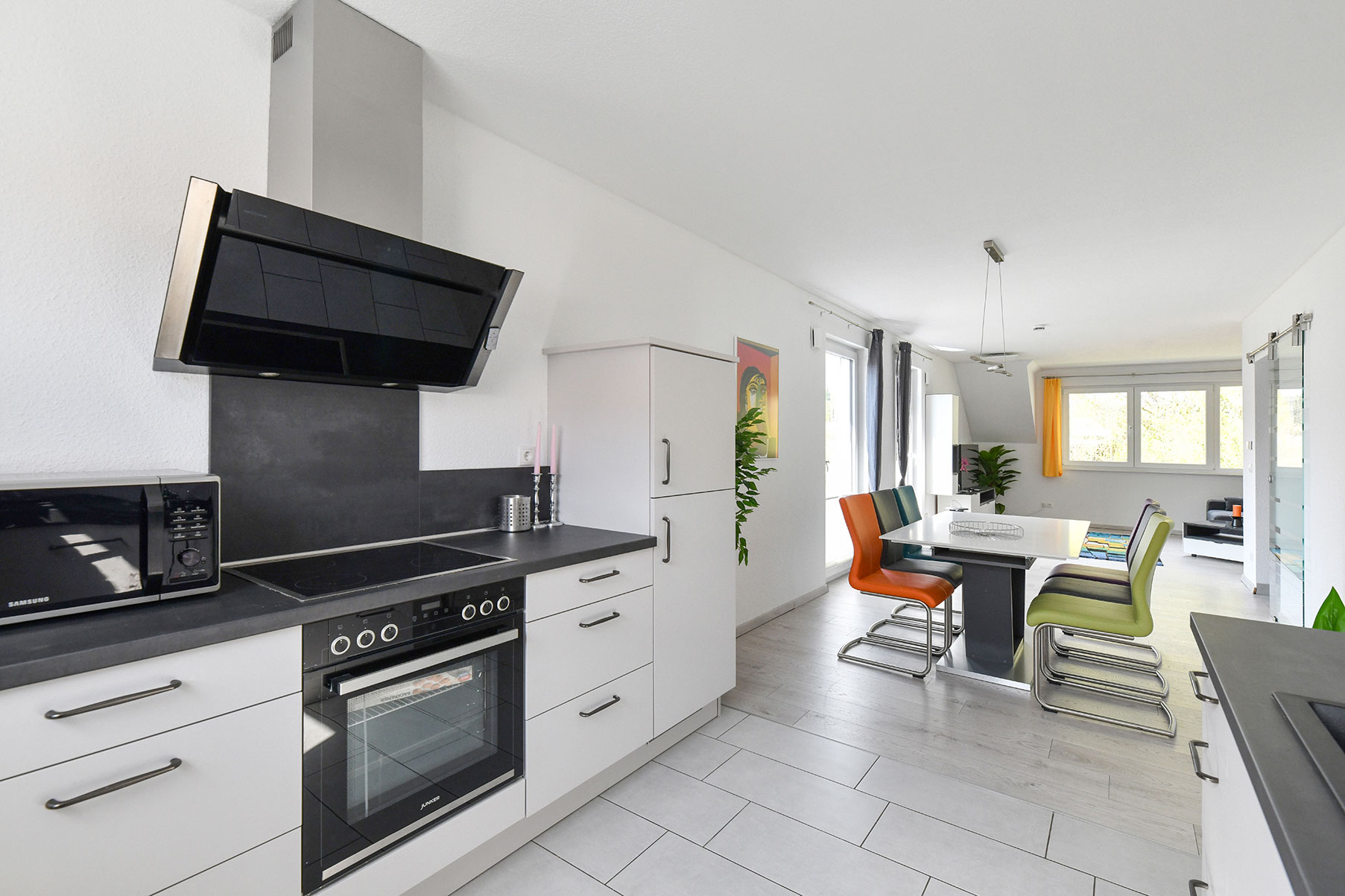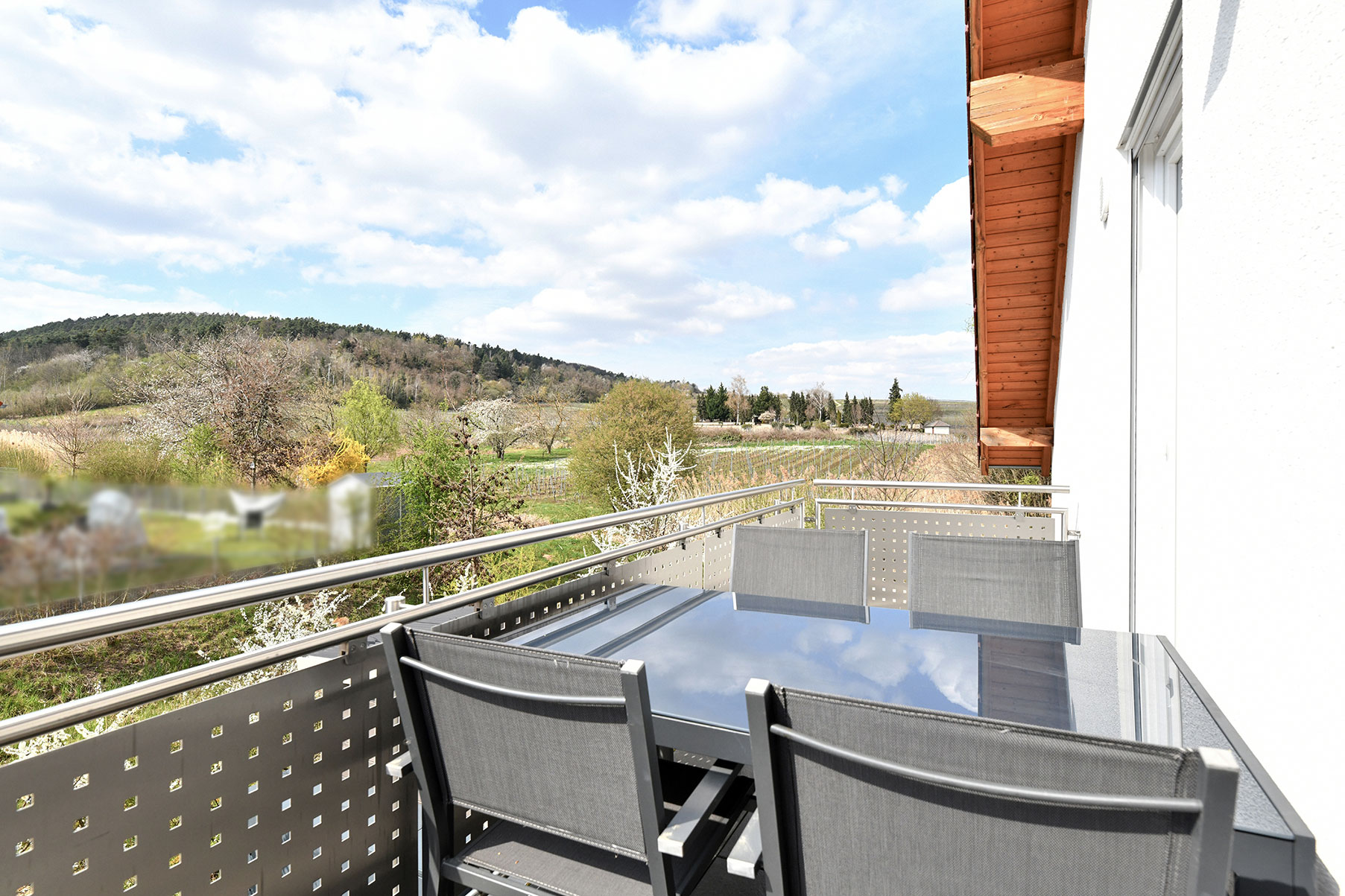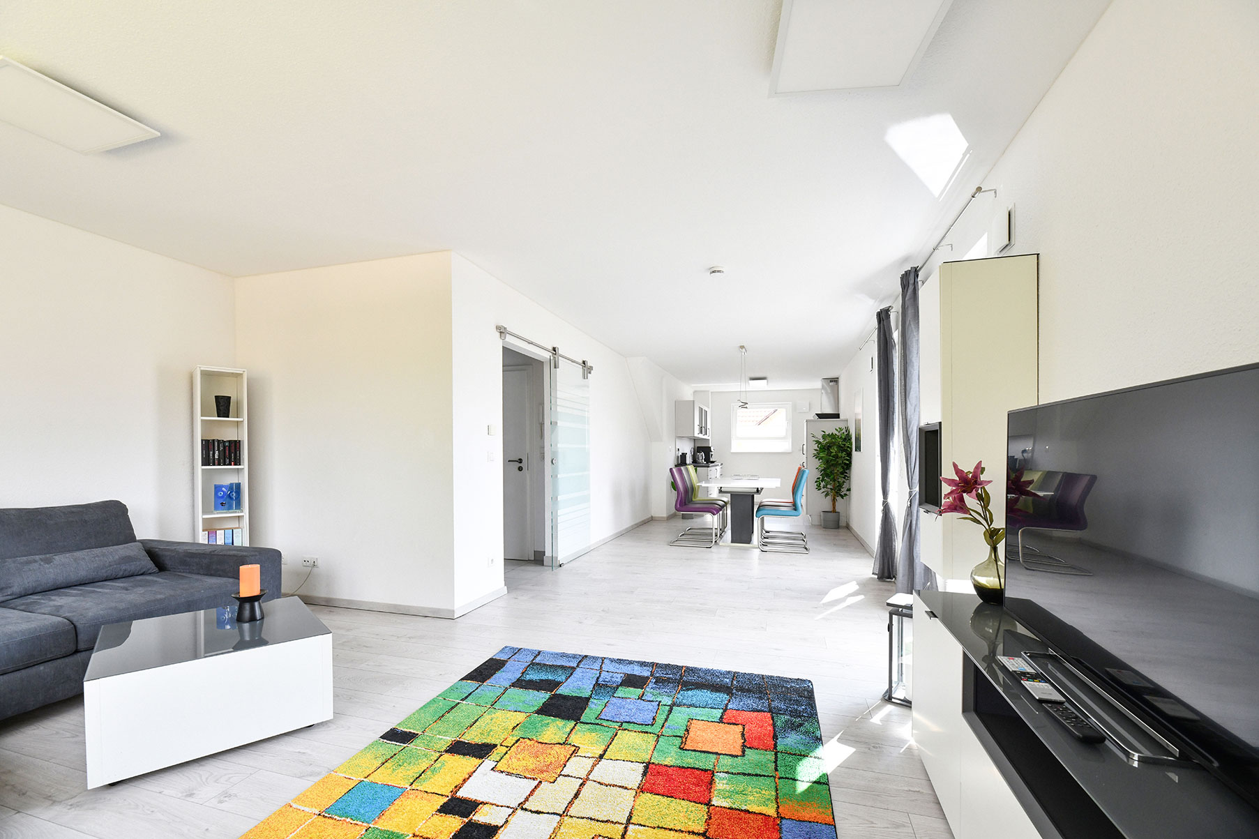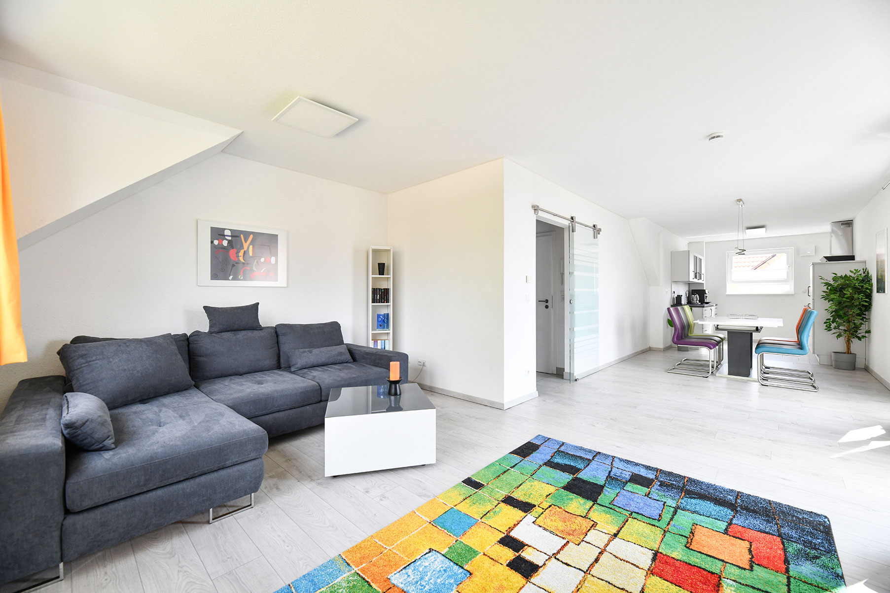 Die Ferienwohnung im 1. OG mit Balkon liegt ruhig am Ortsende und grenzt unmittelbar an das Naturschutzgebiet Berntal. Sie ist im puristischen Design mit fröhlichen Farbakzenten eingerichtet und hochwertig ausgestattet. Die offene Bauweise von Küche, Essbereich und Wohnzimmer mit großem kuschligem Sofa lädt zur gemeinsamen Zeit ein. Der große Smart-TV mit Magenta-TV ermöglicht den spannenden Spielfilmabend. Die Designerküche verfügt über einen Kühlschrank mit Gefrierfach und Backofen, Geschirrspülmaschine, Kaffeevollautomat, Wasser-/Teekocher, Toaster und ein überdurchschnittliches Sortiment an Geschirr und Kochutensilien.